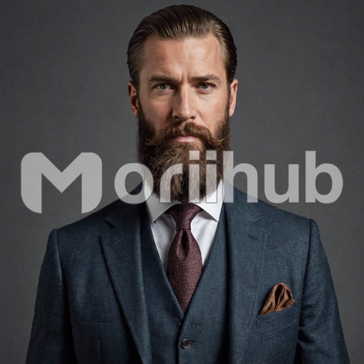 A vision of refined elegance emerges against a plain backdrop, as a dapper man stands tall in a finely tailored suit. His groomed beard adds a touch of rugged sophistication to his polished appearance. With an air of confidence, he exudes timeless charm and grace. Against the simplicity of the background, his presence commands attention, a testament to the power of understated style. In this minimalist setting, he stands as a symbol of classic sophistication, embodying the essence of sartorial excellence.