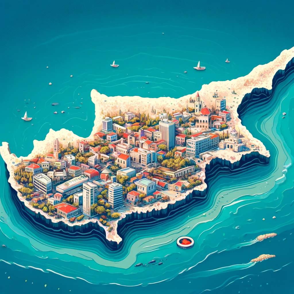In this stylized artistic illustration of Cyprus, the island’s geographical shape is highlighted with intricate detail and vibrant colors. Major cities such as Nicosia, Limassol, Larnaca, Paphos, and Famagusta are depicted with iconic landmarks and symbols, adding depth and character to the composition. The coastline curves gracefully, framed by azure waters, while the inland terrain features rolling hills and mountain peaks. This artistic rendition captures the essence of Cyprus, blending geography with imagination to create a visually striking portrayal of this Mediterranean gem.