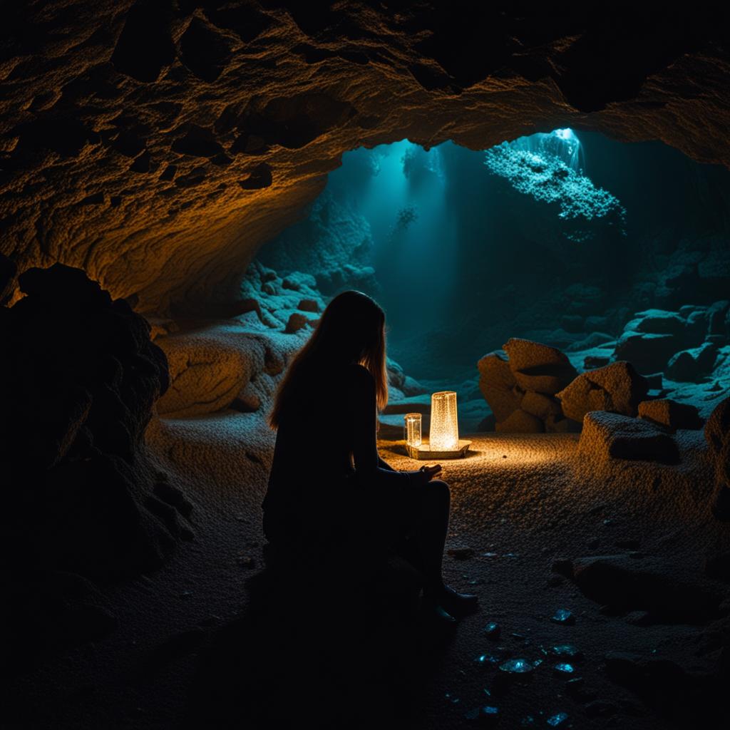 In the profound darkness of a hidden cave, a solitary girl stands, surrounded by shadows that cling to the ancient walls. Feeble beams of light barely reveal the contours of her face, reflecting a delicate mixture of trepidation and curiosity. Her silhouette, an enigma in the obsidian abyss, embodies the silent dance between vulnerability and the unknown, as she navigates the mysteries concealed in the subterranean embrace.