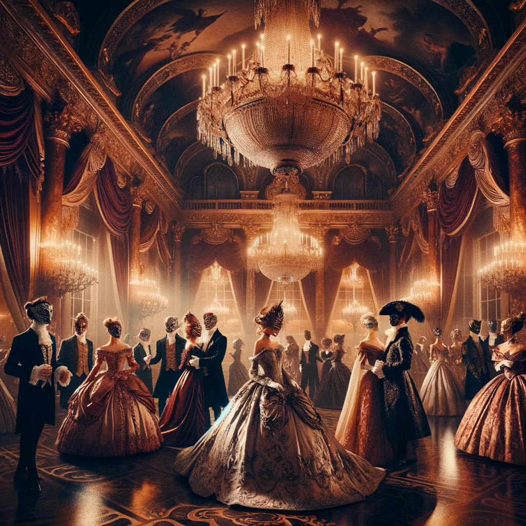 In the grandeur of an opulent ballroom, a lavish masquerade ball unfolds, dripping with elegance and mystery. Glittering chandeliers cast cascades of light upon the scene, illuminating intricate decorations and sumptuous furnishings. Dramatic curtains frame the space, adding to the allure of the evening’s festivities. Masks conceal identities, heightening the sense of intrigue and enchantment as guests dance and revel in this spectacle of luxury and glamour.