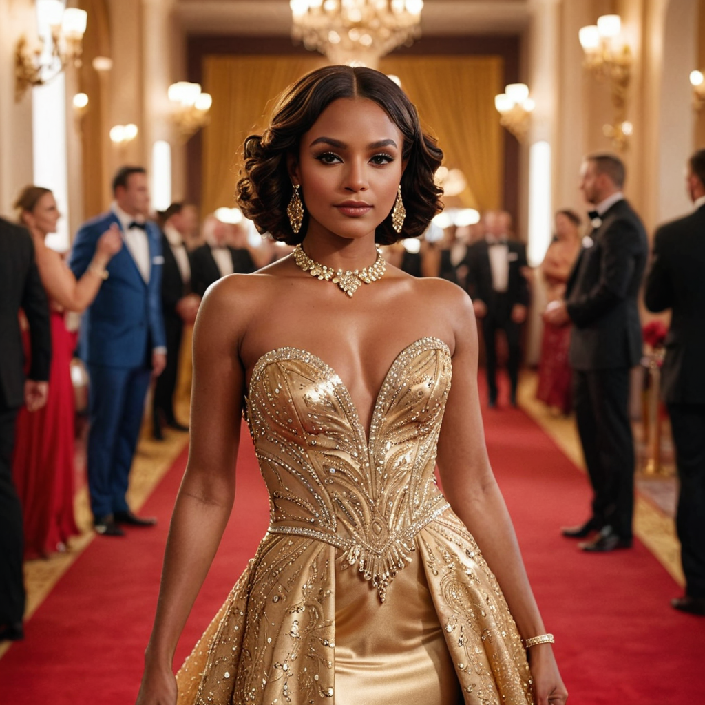 In the grand hall, a beautiful woman stands elegantly adorned in a stunning gown, commanding attention with her graceful presence. She exudes confidence as she mingles with the crowd, her poise and sophistication drawing admiring glances from those around her. Behind her, a sea of people dressed in their finest attire adds to the vibrant atmosphere of the event. Amidst the bustling gathering, she shines like a beacon of refined beauty and charm.