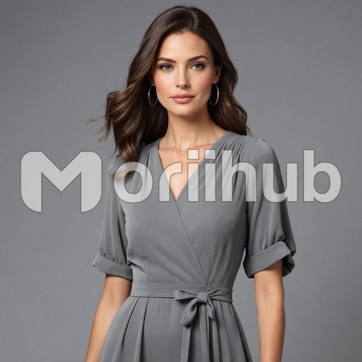In a plain background, a woman captivates in a flowing gray gown that drapes elegantly around her figure. The gown’s soft fabric cascades gracefully, enhancing her silhouette with every gentle movement. Her gaze is forward, reflecting confidence and poise, while her expression exudes a quiet strength and inner beauty. The simplicity of the backdrop accentuates the gown’s subtle details and the woman’s serene demeanor, creating a scene of timeless elegance and grace. It’s a portrait where sophistication meets understated glamour, capturing a moment of quiet contemplation and refined beauty.
