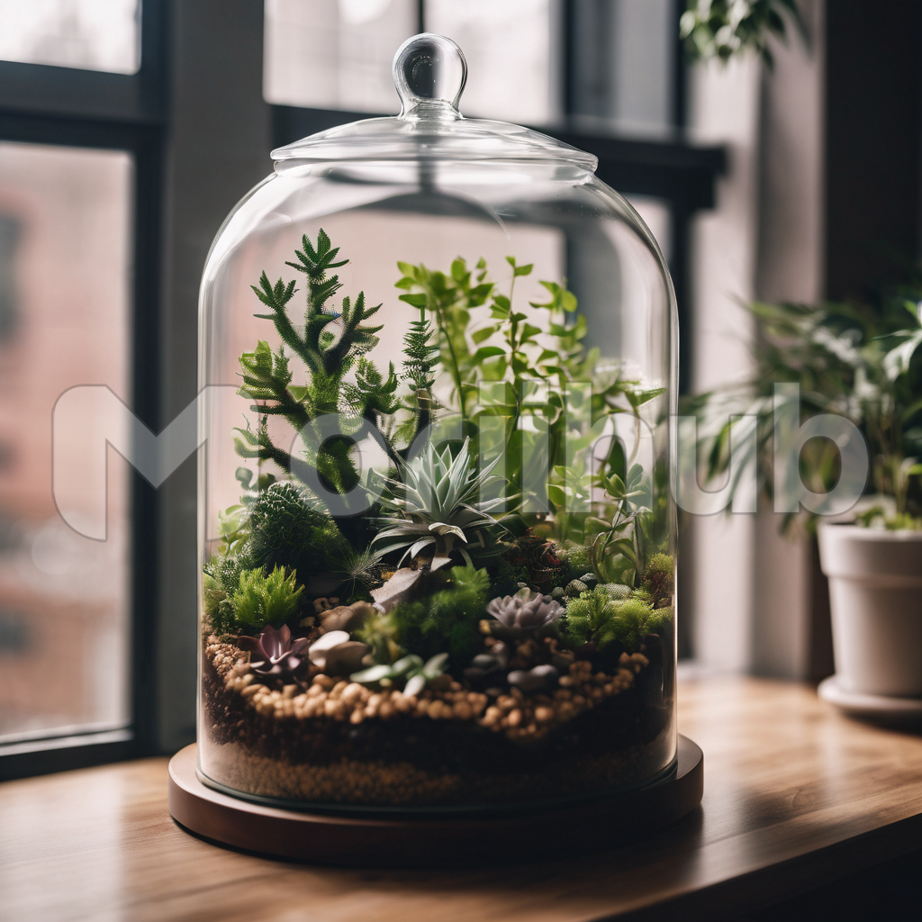 A sealed terrarium rests gracefully atop a tabletop, encapsulating a miniature ecosystem within its transparent confines. The lush greenery, delicate plants, and vibrant moss create a self-sustained world, shielded by the crystal-clear walls. Every detail is a testament to nature’s beauty, thriving in the harmonious balance of light, moisture, and sealed tranquility. The terrarium stands as a captivating microcosm, a living spectacle encased in glass, captivating observers with its self-contained allure.