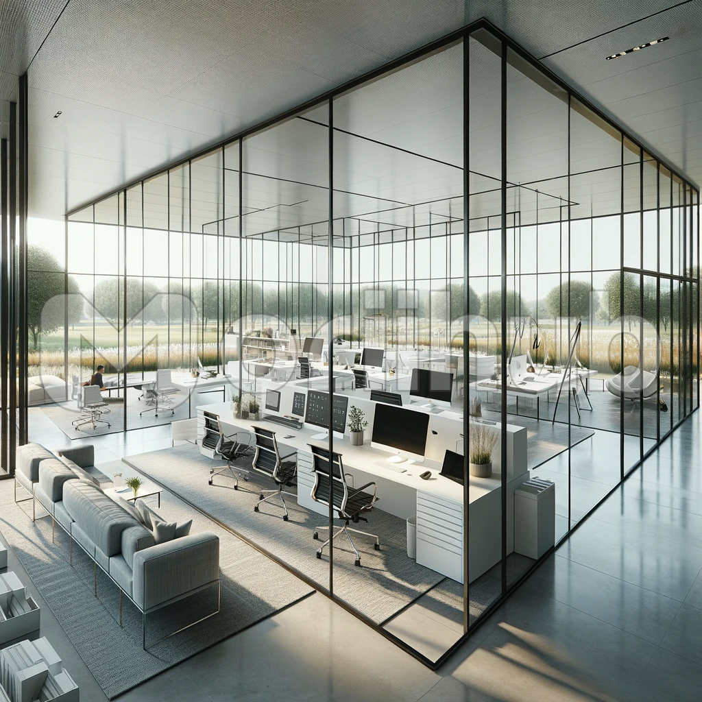 This modern glass house office is a masterpiece of contemporary design. Its sleek, minimalist aesthetics are elevated by the floor-to-ceiling glass walls that envelop the entire structure, providing an unobstructed and awe-inspiring panoramic view of the surrounding landscape. Natural light floods the interior, seamlessly merging the workspace with the outdoors, creating an inspiring environment that seamlessly melds modernity with the natural world. This office is a testament to the power of architectural innovation and offers a serene and productive workspace bathed in the beauty of nature.