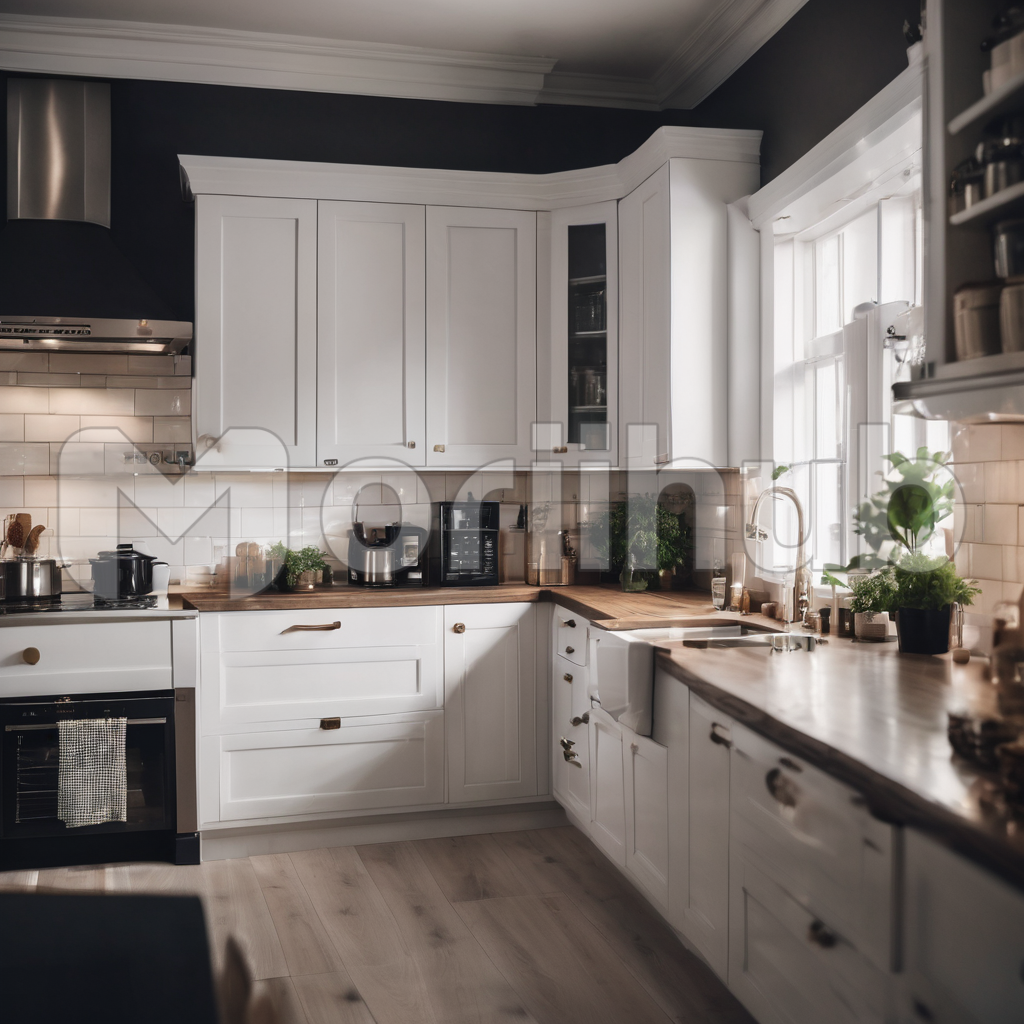 In a well-organized kitchen, functionality and aesthetics coexist harmoniously. Sleek countertops stretch along the walls, adorned with gleaming stainless steel appliances. Overhead, pendant lights cast a warm glow, illuminating the culinary workspace. Cabinets of rich wood offer ample storage for cookware and utensils. At the center, a spacious island invites culinary creativity, while barstools provide a cozy spot for casual gatherings. It’s a kitchen that seamlessly blends style and practicality, a hub of culinary inspiration.