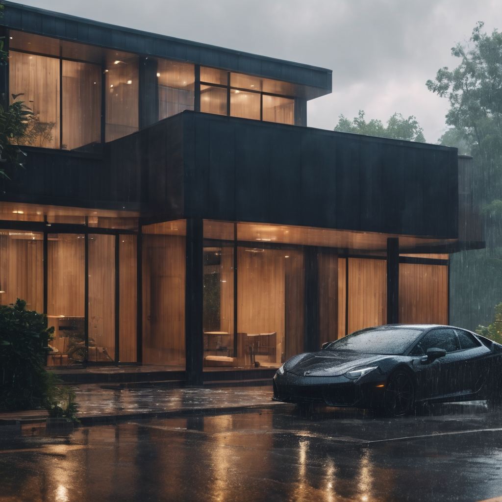 In the quiet embrace of rain, a home stands adorned with glistening raindrops, reflecting the ambient glow. A solitary car, parked beside the house, wears a jeweled cloak of raindrops. The serene scene evokes a sense of tranquility, as nature’s tears kiss the surfaces, creating a harmonious dance between shelter and the elements.