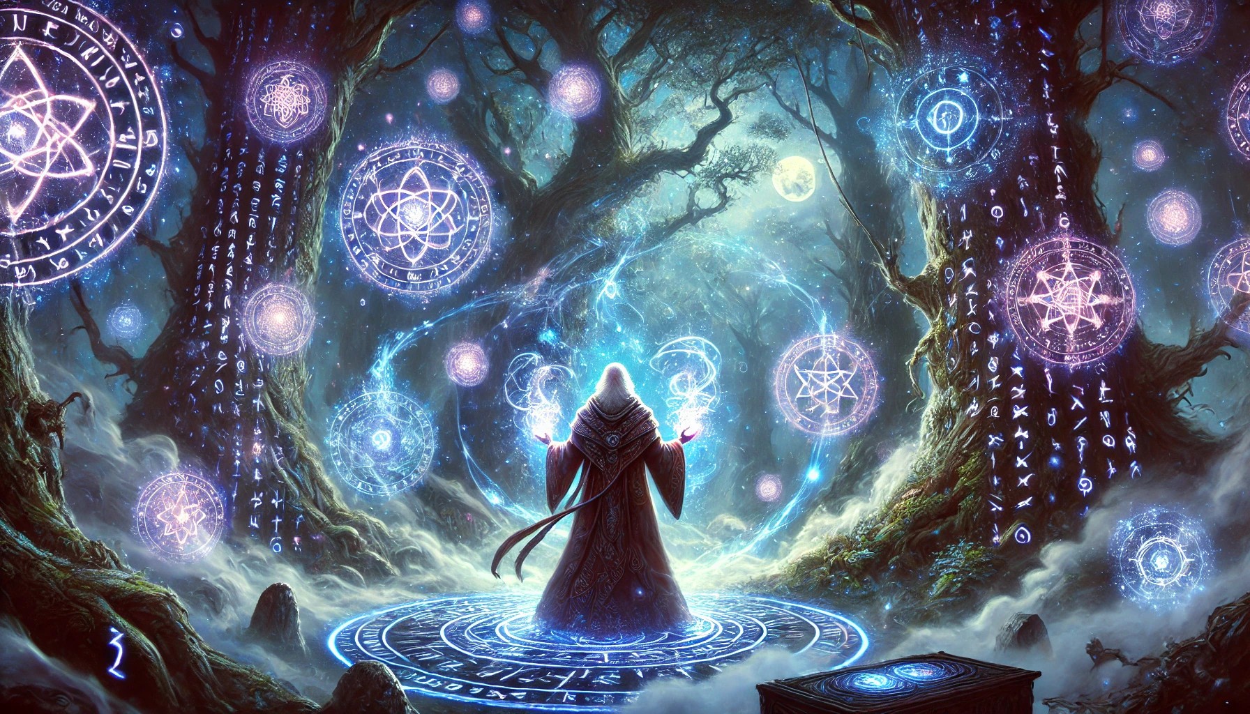 This illustration captures the mystical essence of an ancient and enchanted world. At the heart of a sacred forest, a mystical sage stands in deep concentration, their eyes shimmering with arcane wisdom. They move their hands in precise, deliberate motions, weaving intricate patterns of glowing energy into a luminous sigil, pulsating with unknown power.