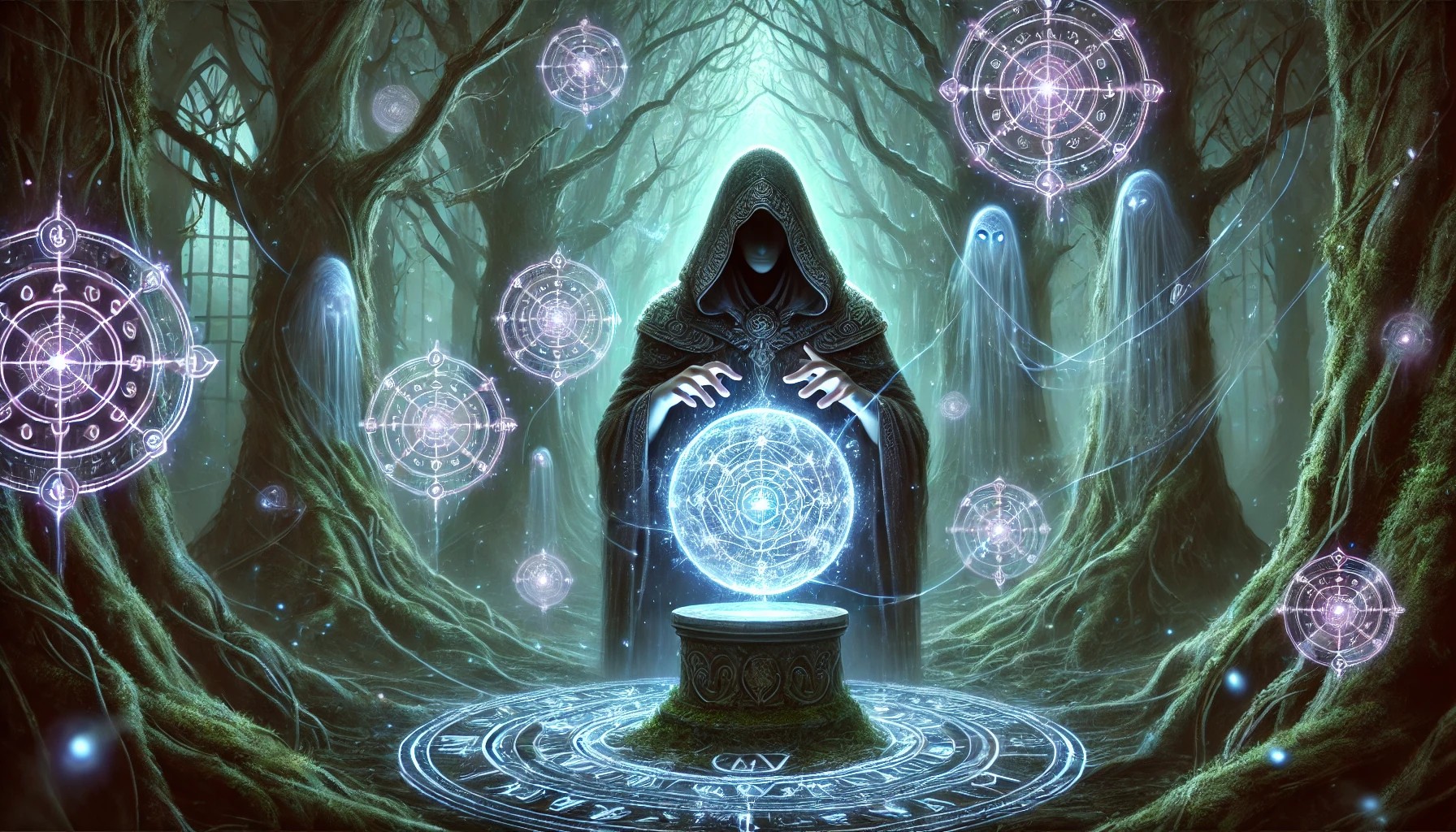 This illustration captures a mystical and enchanting scene, where ancient wisdom and cosmic energy converge. At the heart of a dense, enchanted forest, a hooded oracle stands before a floating crystal sphere, their eyes radiating with an ethereal glow. Their hands hover over the sphere, channeling unseen arcane forces, as shifting visions of distant realms and hidden truths swirl within the crystal’s depths.