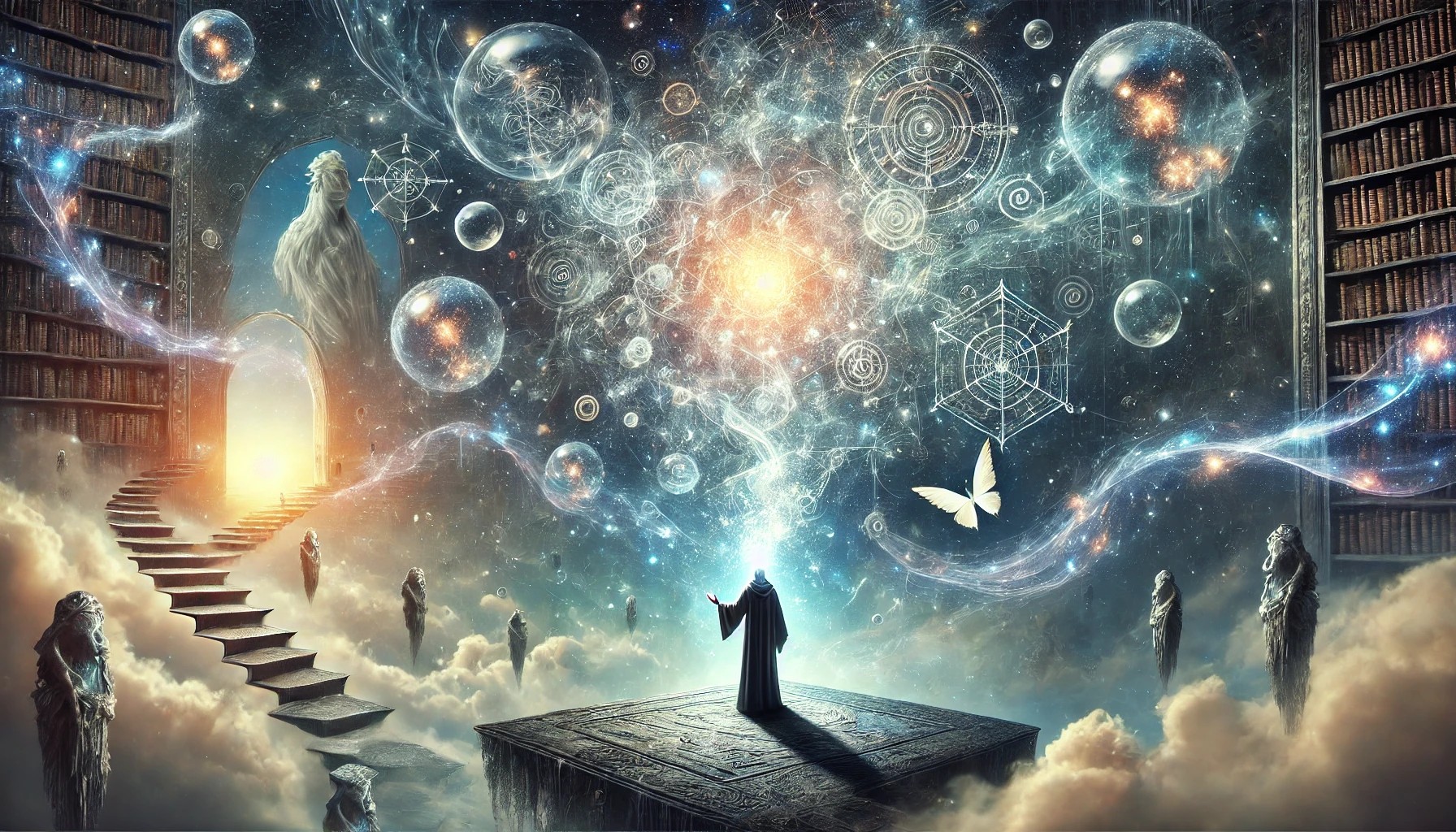 This illustration captures a surreal and mystical moment where the power of the mind shapes reality itself. A lone sorcerer floats weightlessly in an expansive dreamscape, their thoughts expanding into an intricate web of glowing energy. From their head, streams of ethereal light pulse outward, forming shifting symbols, ancient runes, and miniature swirling galaxies, each representing a different thought, memory, or vision.