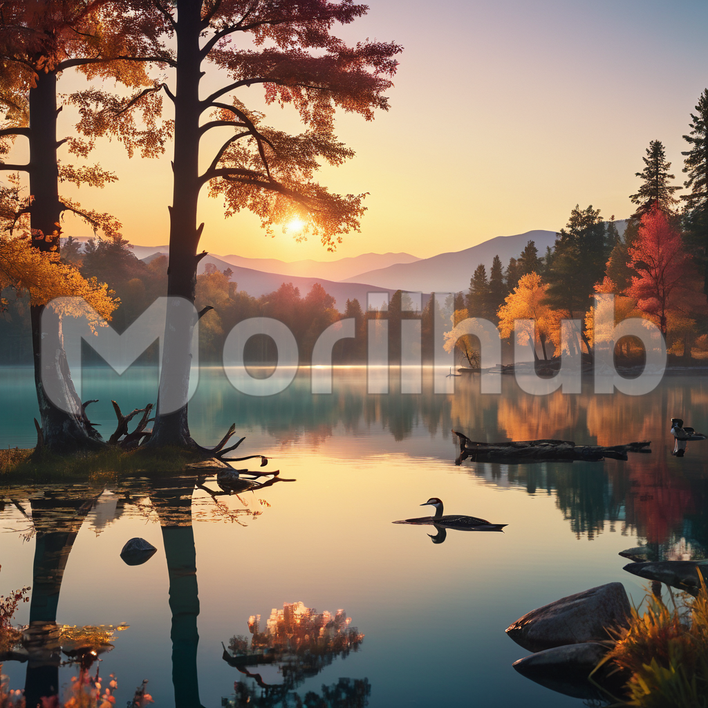 As the sun descends, its golden rays kiss the tranquil lake, casting shimmering reflections upon its glassy surface. Surrounding the water’s edge, lush greenery paints the landscape with vibrant hues, while a solitary tree stands sentinel in the corner, its silhouette etched against the fiery sky. A duck gracefully glides across the water, adding to the serene scene. Above, the clear sky completes the picturesque sunset, a masterpiece of nature’s grandeur.