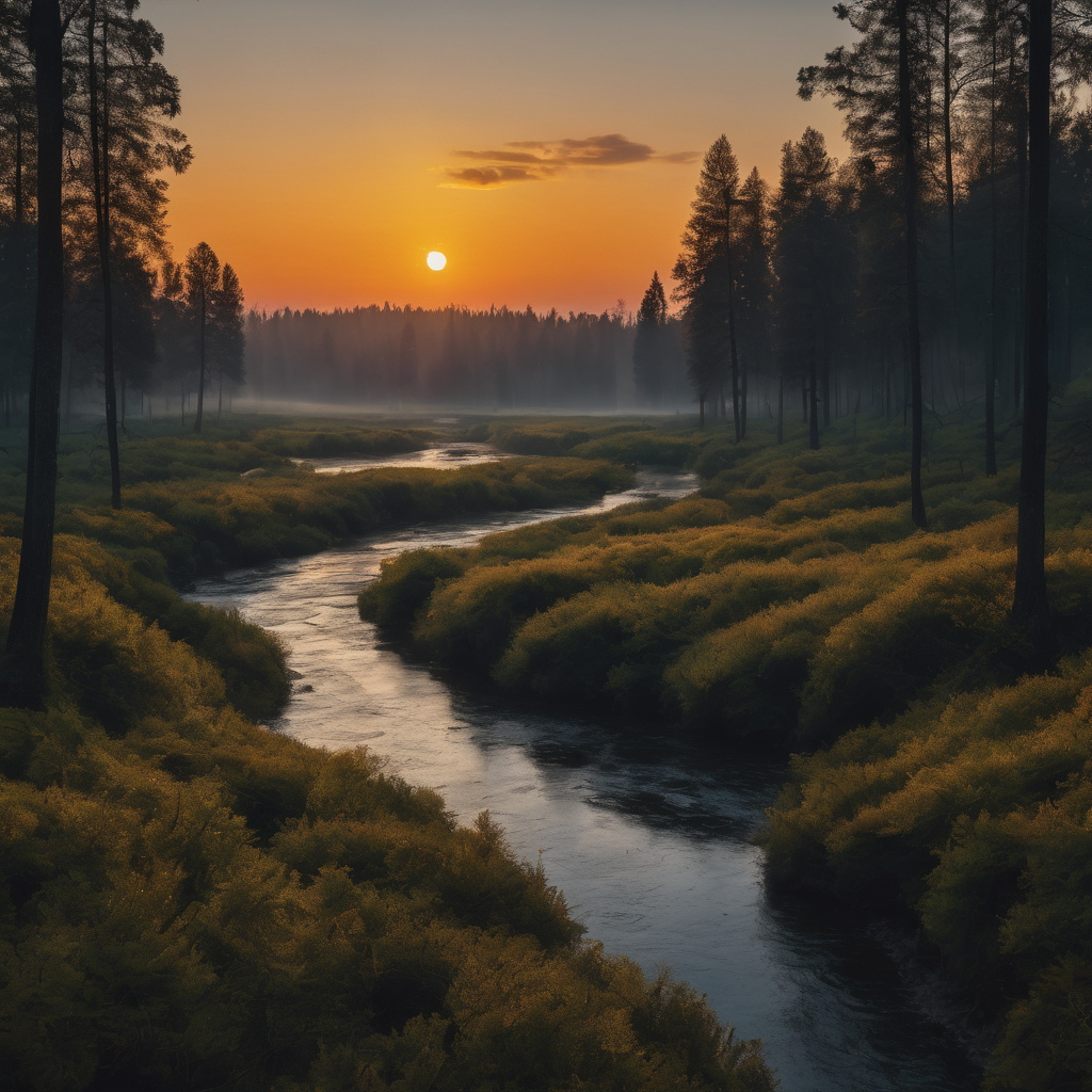 As the sun descends, its golden rays dance upon the river’s surface, casting a mesmerizing reflection. Lush greenery lines the riverbanks, their vibrant hues accentuated by the fading light. Towering pine trees stand sentinel, their silhouettes etched against the colorful sky. The tranquil scene bathes in a warm glow, invoking a sense of peace and serenity, as nature’s canvas transforms into a breathtaking masterpiece under the evening’s embrace.