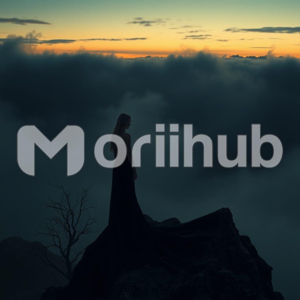 A silhouette of a woman stands poised on a rugged rock against the twilight sky, her form outlined against the fading light. The colors of the twilight blend into a soft gradient, with deepening shades of blue and purple enveloping the scene. Her posture is graceful and contemplative, capturing a moment of quiet solitude. The rock beneath her adds a sense of stability and grounding, contrasting with the ethereal glow of the twilight. The scene conveys a serene and introspective beauty, framed by the encroaching dusk.