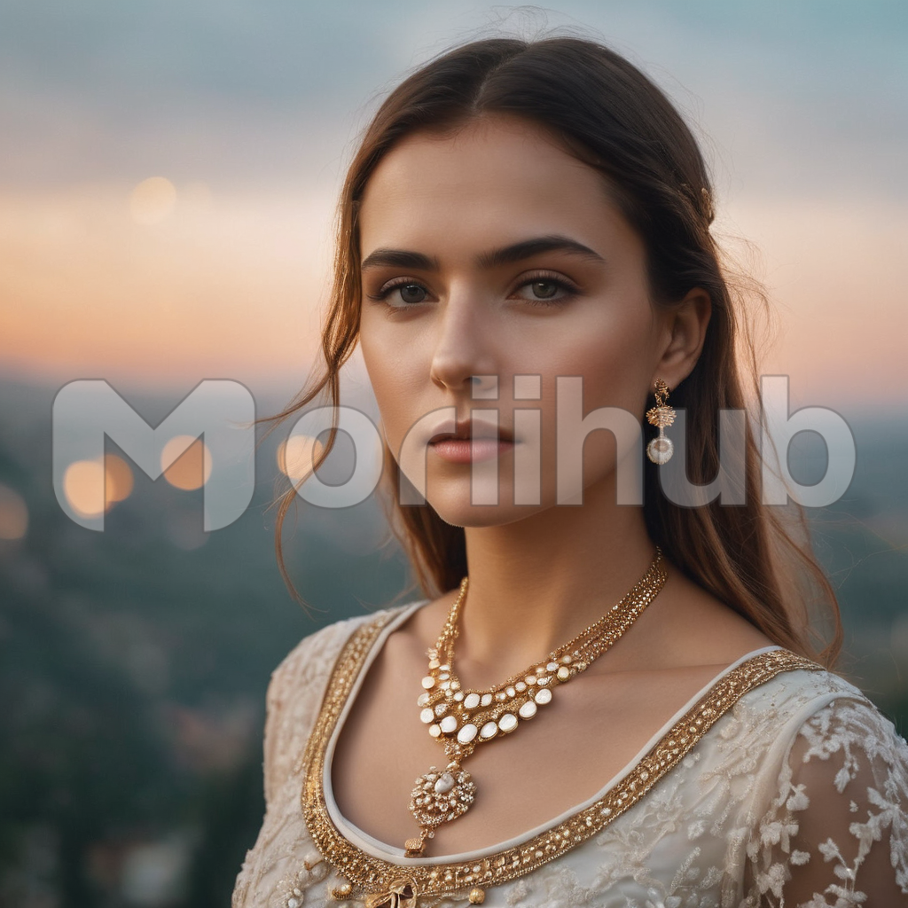 Radiating elegance, a beautiful woman captivates with a serene gaze, her eyes fixed on a distant horizon. Adorned with grace, a delicate necklace enhances her allure, a subtle accent to her timeless beauty. The air carries an aura of sophistication as her presence evokes a magnetic charm. In this moment, the woman becomes a living portrait, an embodiment of grace and allure, a testament to the enduring enchantment of a captivating gaze and tasteful adornment.