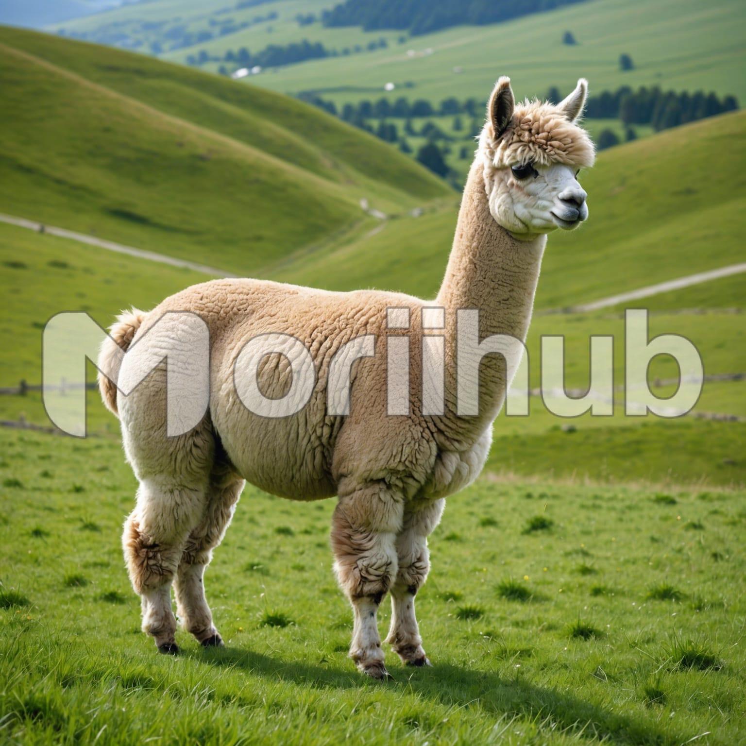 An alpaca stands gracefully in a lush field, its soft, fleece-covered body glowing in the gentle sunlight. The rolling hills behind it create a picturesque backdrop of verdant green waves, adding to the serene landscape. Its large, expressive eyes and gentle demeanor exude a sense of calm curiosity as it grazes on the tender grass. The alpaca’s long neck and elegant posture give it an almost regal appearance, blending harmoniously with the tranquil surroundings. This idyllic scene captures the peaceful coexistence of nature and wildlife, evoking a sense of pastoral bliss.