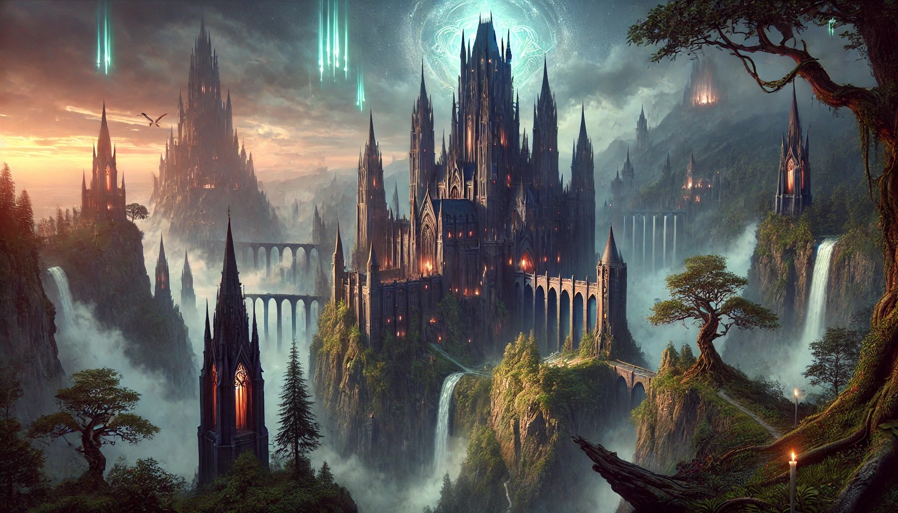 The illustration depicts a grand and imposing castle, standing proudly atop a towering cliff in a mystical fantasy world. The castle is constructed from dark stone, with tall spired towers that reach into the sky, disappearing into misty clouds. Intricate carvings and glowing runes adorn the castle’s walls, hinting at its magical and ancient origins.