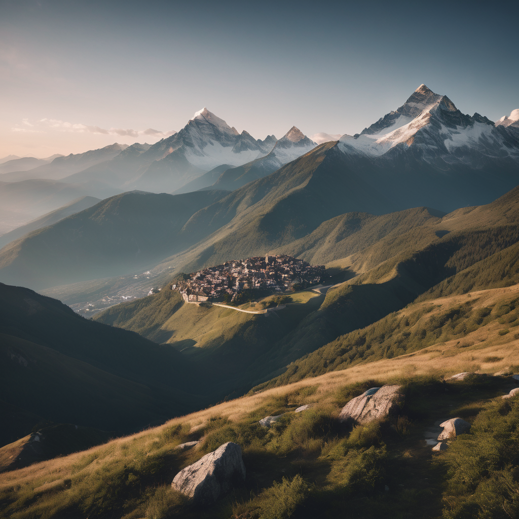 Beneath a somber and overcast sky, a vast mountain range stretches towards the horizon. The muted colors of the landscape blend seamlessly with the dull, heavy heavens above. Towering peaks and rugged valleys create a breathtaking vista, their imposing presence softened by the subdued atmosphere. Despite the lack of vibrant hues, there’s a serene and timeless beauty in the quietude of the mountain range, where nature’s grandeur meets the tranquil embrace of a dull sky.