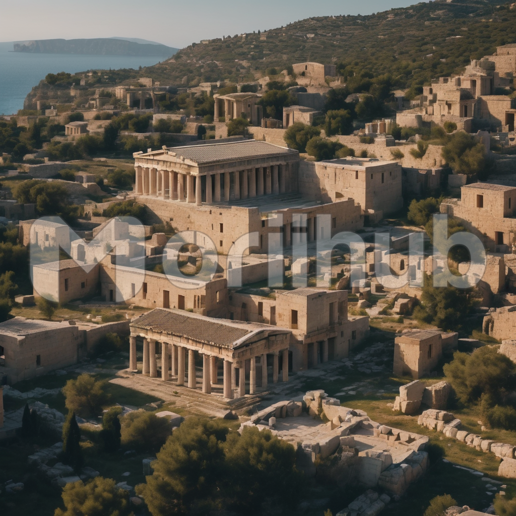 From above, an ancient Greek city sprawls gracefully across the landscape, its white buildings gleaming in the sunlight. Narrow streets wind through the city, leading to bustling marketplaces and grand amphitheaters. In the distance, lush greenery blankets the hillsides, providing a picturesque backdrop to the city’s timeless beauty. This aerial view captures the essence of ancient Greek civilization, with its harmonious blend of architectural marvels and natural splendor.