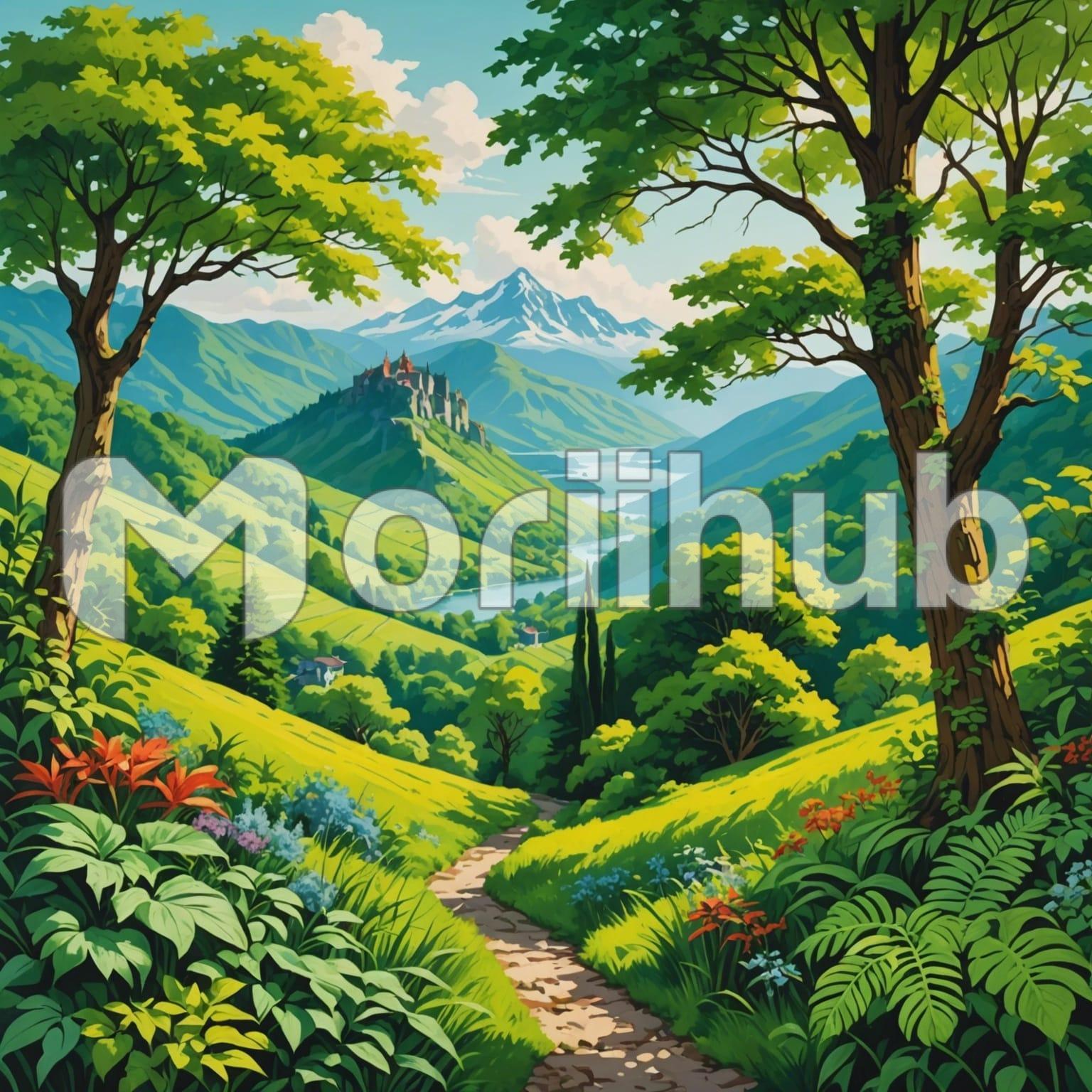 A winding path meanders through lush greenery, its verdant hues blending with the vibrant landscape. Towering trees stand sentinel along the way, their rustling leaves a soothing melody in the gentle breeze. Beyond, majestic green mountains loom on the horizon, their peaks touching the sparse clouds drifting lazily overhead. In a corner, a burst of wildflowers adds splashes of color to the scene, their petals swaying in harmony with nature’s rhythm. The path beckons, promising a journey of tranquility amidst the breathtaking beauty of the natural world.