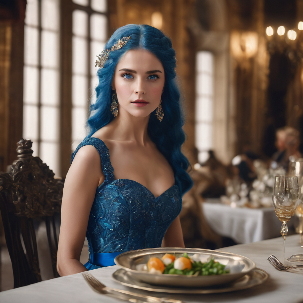 Seated regally in a luxurious hall, a stunning woman enchants with her azure gaze, perfectly complementing the rich blue of her elegant gown. Her poise and grace command attention as she dines amidst opulence, surrounded by the finest cuisine. The ambiance is one of refined splendor, with flickering candlelight and ornate décor adding to the allure. In this scene of sophistication, she epitomizes timeless beauty and effortless elegance.