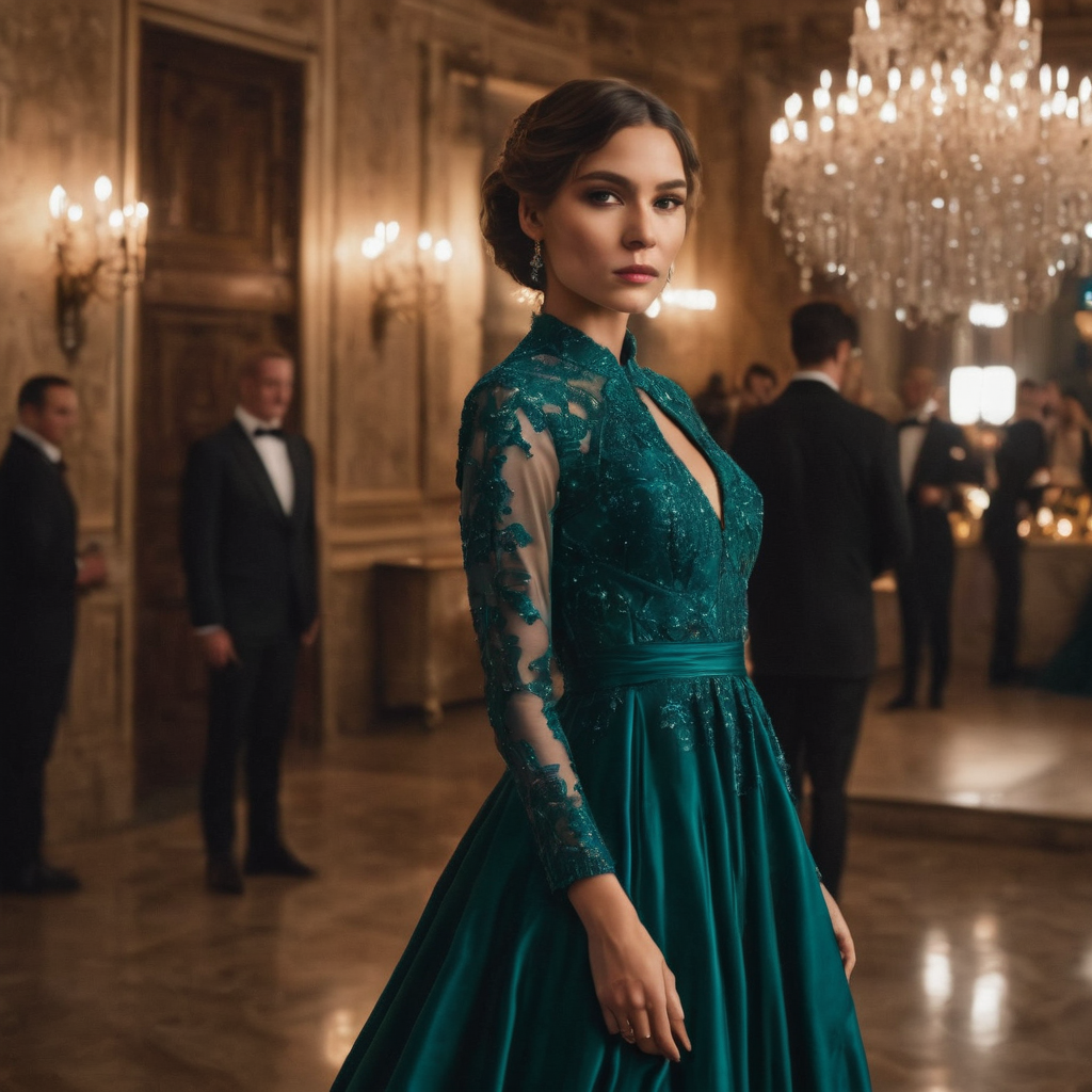 A woman dons a resplendent teal dress, a vision of elegance, standing in a grand hall. The rich hue accentuates her grace as she becomes a focal point in the sophisticated space. People milling in the background add a lively backdrop, contributing to the ambiance. Above, a stunning chandelier graces the ceiling, casting a warm glow. In this hall, a tapestry of beauty unfolds, combining fashion, people, and opulent decor into a harmonious visual symphony.