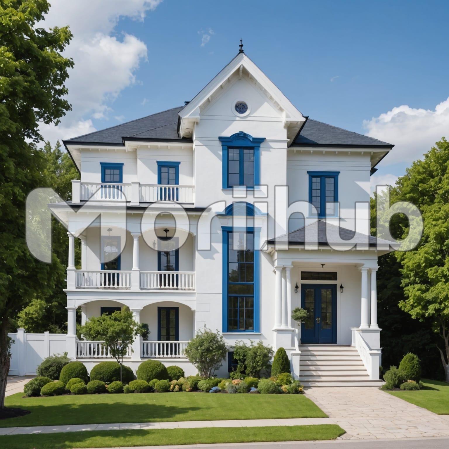 A charming house stands proudly, painted a crisp white that gleams in the natural light. Its simple yet elegant architecture features a welcoming porch adorned with subtle details. Surrounding the home, lush greenery flourishes, with vibrant plants and trees that create a serene atmosphere. The soft rustle of leaves adds to the tranquility of the scene. Above, wisps of clouds drift lazily across the sky, casting gentle shadows on the landscape. This picturesque setting evokes a sense of peace and harmony, capturing the beauty of nature in a cozy, inviting home.