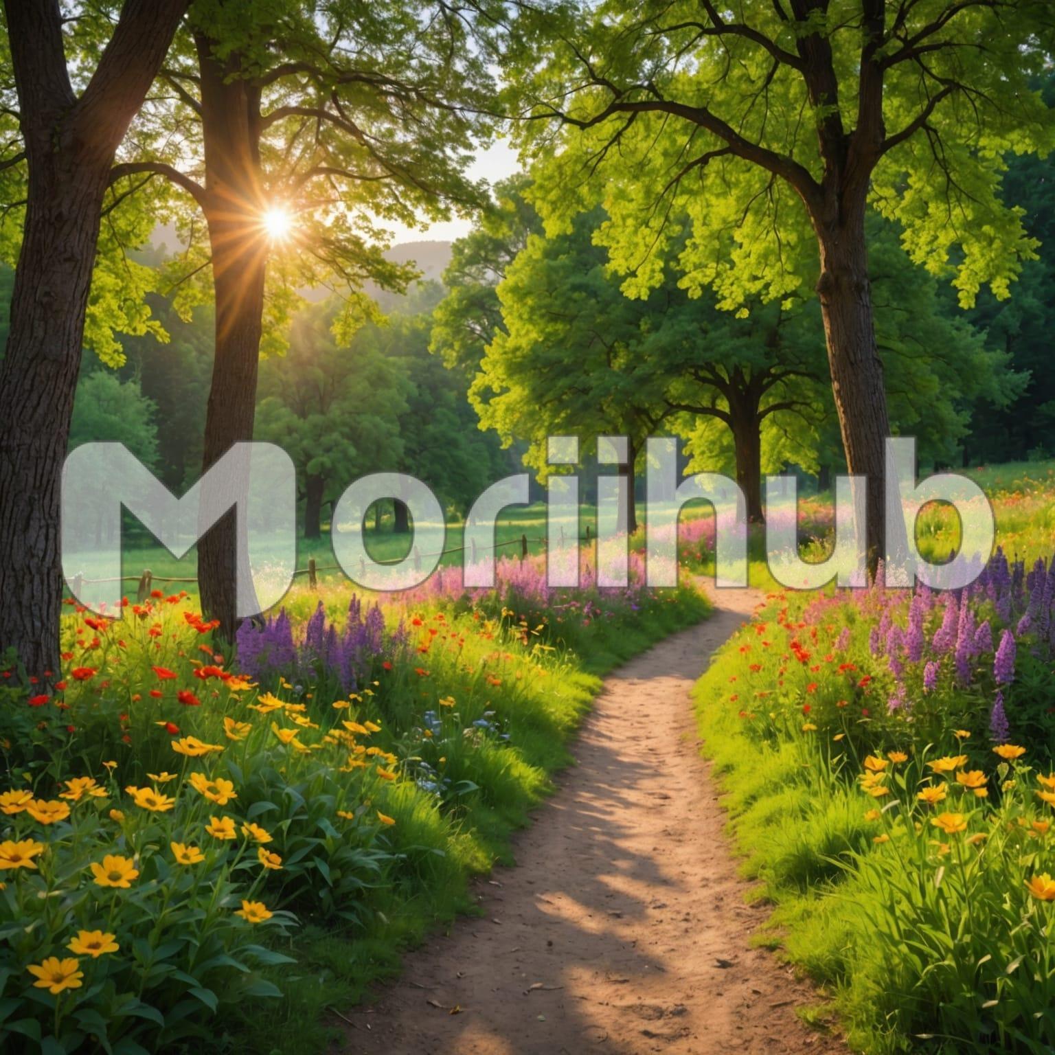 The trail winds gently through nature, bordered by vibrant wildflowers and tall, majestic trees on either side. Sunlight filters through the leafy canopy, casting dappled patterns on the path and highlighting the colorful blooms that dot the ground. The air is fresh and filled with the scent of flowers and earth, creating a sense of calm and rejuvenation. The sunlight peering through the foliage adds a warm, golden glow, making the trail feel inviting and peaceful.