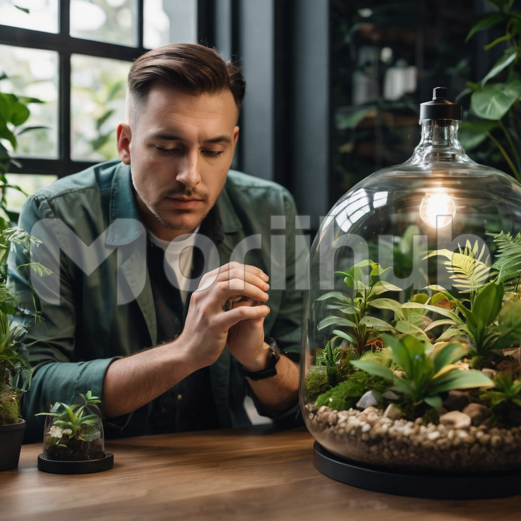 A man stands with an air of quiet contemplation, hands clasped, deeply engrossed in the miniature ecosystems displayed on a tabletop. His eyes, filled with curiosity and appreciation, survey the intricate terrariums, each a tiny world encapsulated within glass. The play of light and shadows highlights his thoughtful demeanor as he marvels at the delicate balance of nature captured in these small, enchanting landscapes, fostering a moment of serene connection with the miniature wonders before him.