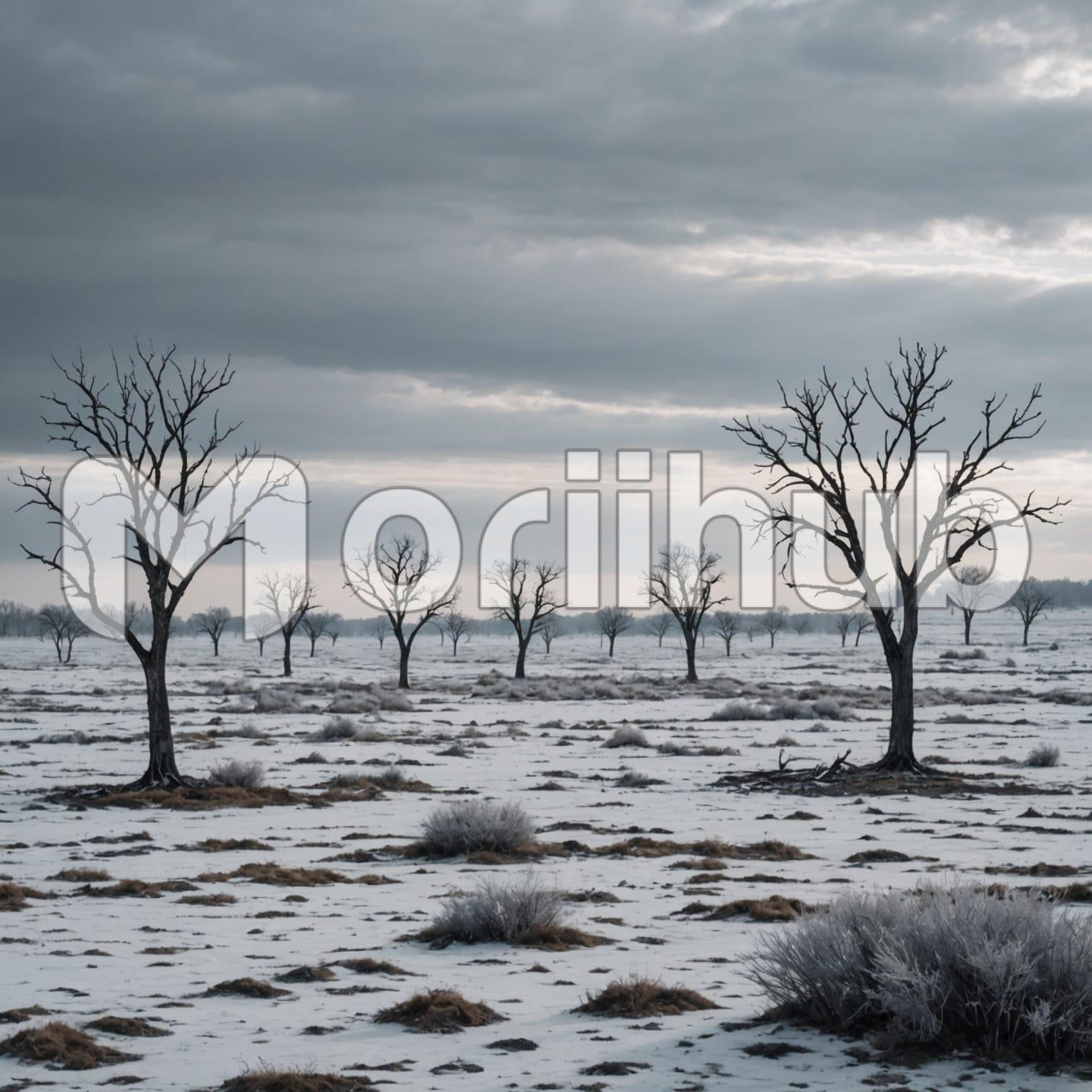 In the icy wasteland, withered trees stand as silent sentinels against the relentless cold. Their skeletal branches reach into a gray sky, stark against the frozen landscape. Snow blankets the ground, pristine and untouched, reflecting the pale light of a distant sky obscured by heavy clouds. The air is still and biting, carrying a sense of desolation and resilience. Despite the harsh conditions, a haunting beauty lingers in the frozen stillness, where nature’s tenacity and the quiet solitude of the wasteland intertwine in a timeless tableau.