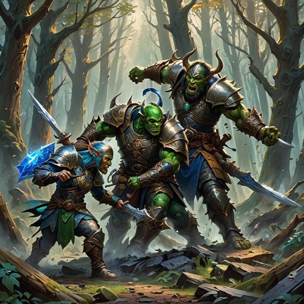 A tense moment in the midst of a forest, where a group of three formidable, green-skinned orc warriors is engaged in a heated confrontation. The scene is set in a dense, sunlit forest, with tall trees and dappled light filtering through the leaves, creating a stark contrast to the intensity of the battle unfolding below.