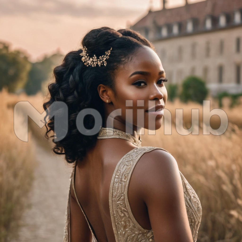 In a breathtaking tableau, a beautiful black woman stands adorned in a resplendent gown, her gaze turned towards the past. The grandeur of a massive house looms in the foreground, a stately witness to her elegance. Against a somber sky, her silhouette becomes a timeless fusion of grace and history, encapsulating the powerful presence of the woman in the regal context of a vast estateāa striking blend of beauty and heritage.