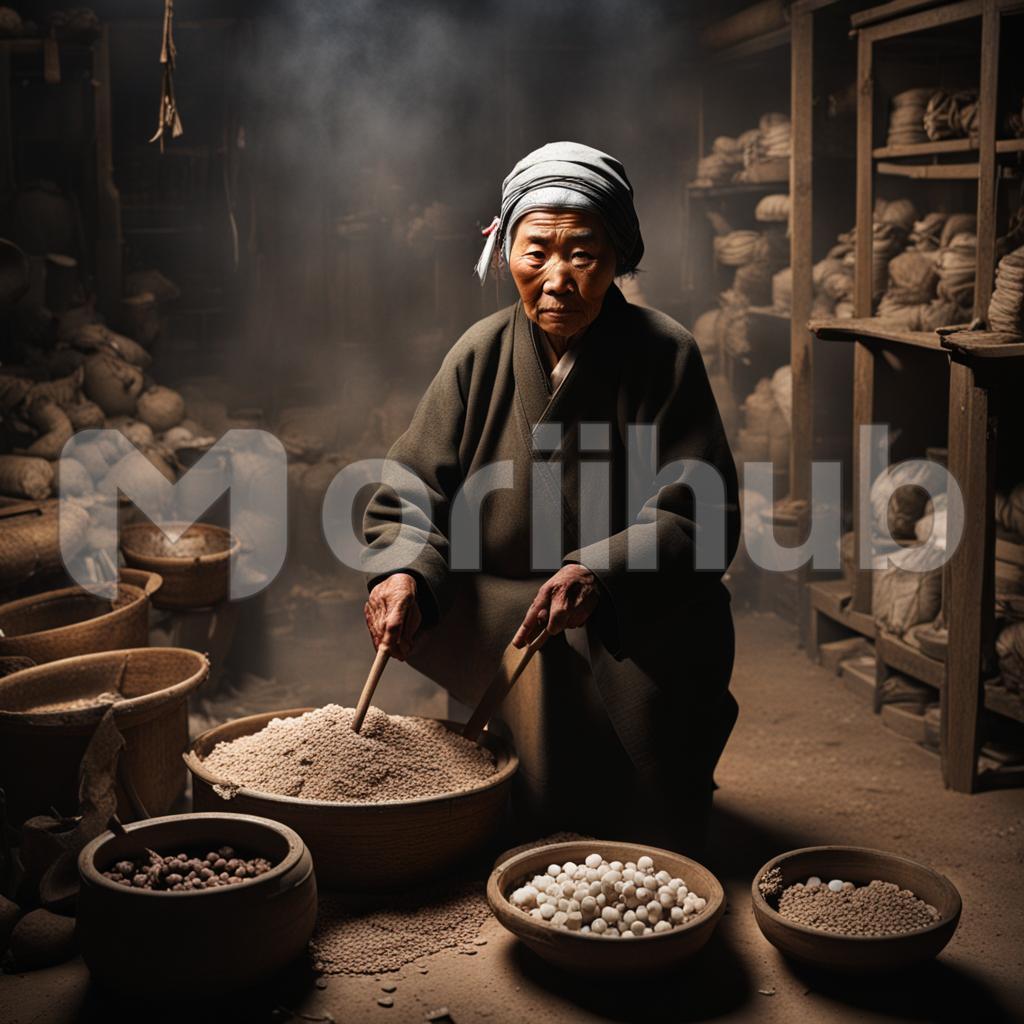 Stepping into the antiquated ambiance of an Eastern medicine shop feels like a journey through time. Sacks of aromatic ingredients line weathered shelves, their earthy scents lingering in the air. Massive, empty bowls await their alchemical transformation, while others cradle a myriad of healing herbs. In the dim light, an elderly woman hunches over, skillfully mixing nature’s remedies with a wisdom etched on her face. The shop resonates with centuries of herbal lore, a sanctuary where tradition and healing coalesce in a tapestry of ancient Eastern medicine.