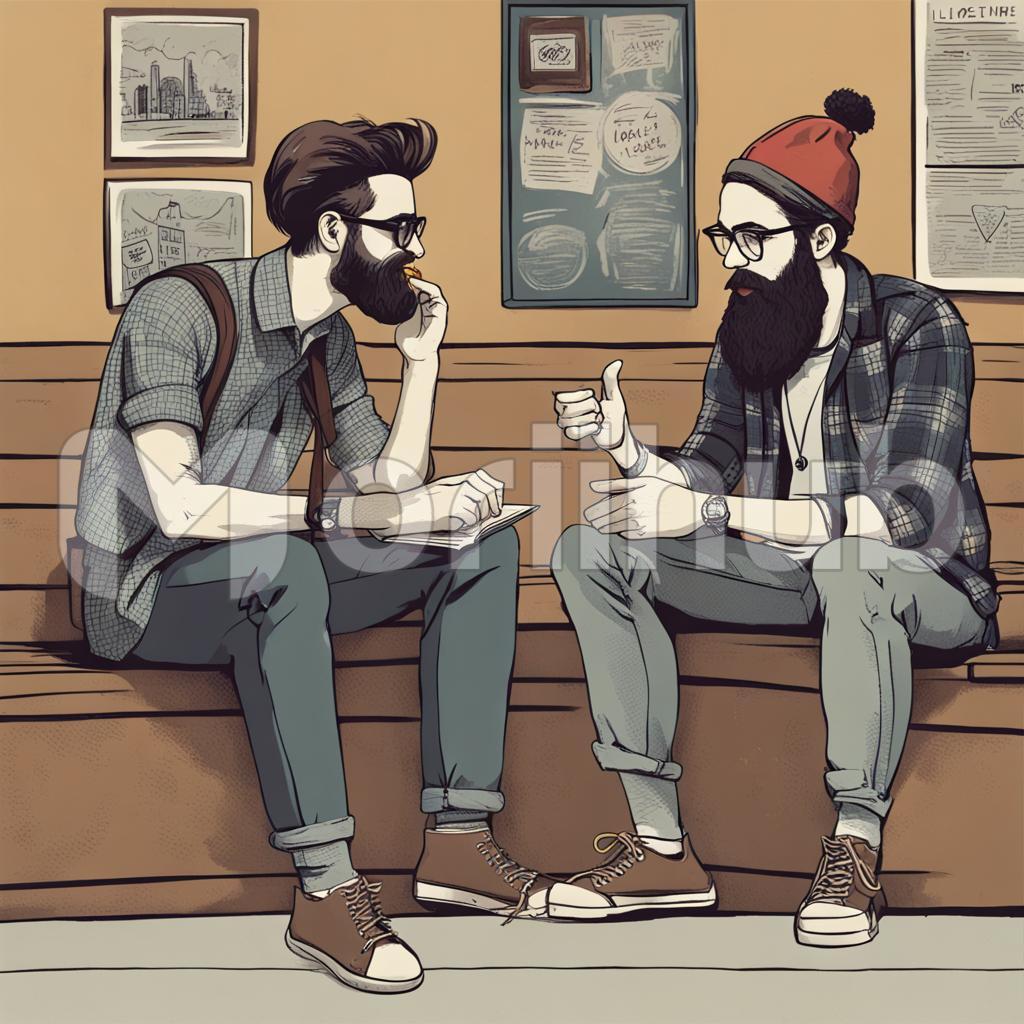 In a quirky cafe adorned with vintage decor, hipsters sit on mismatched chairs, engrossed in animated discussions. Their eclectic fashion sense mirrors the diversity of topics—artisanal coffee blends, obscure indie films, and sustainable living. The air is thick with the aroma of espresso and the buzz of intellectual banter, creating a bohemian enclave of ideas and aesthetics.
