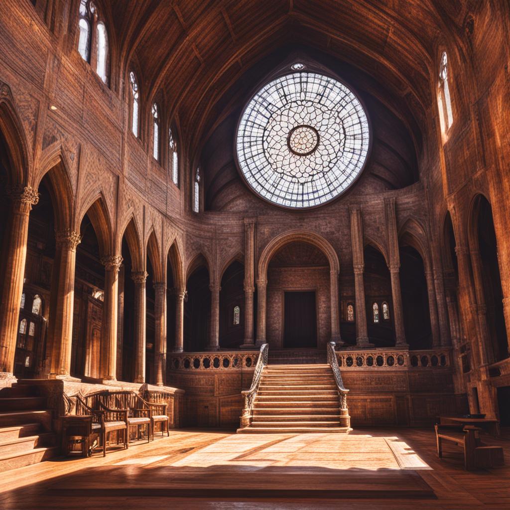 Within the ancient palace hall, time stands still, and history whispers through intricately carved walls. Majestic pillars reach for the heavens, supporting an opulent ceiling adorned with faded frescoes. Sunlight filters through stained glass windows, casting an ethereal glow on marble floors that bear witness to centuries of regal tales. The air is steeped in the weight of antiquity, and every corner exudes a sense of grandeur, echoing the splendor of bygone eras. The palace hall stands as a living testament to the artistry and legacy of a civilization lost in the sands of time.