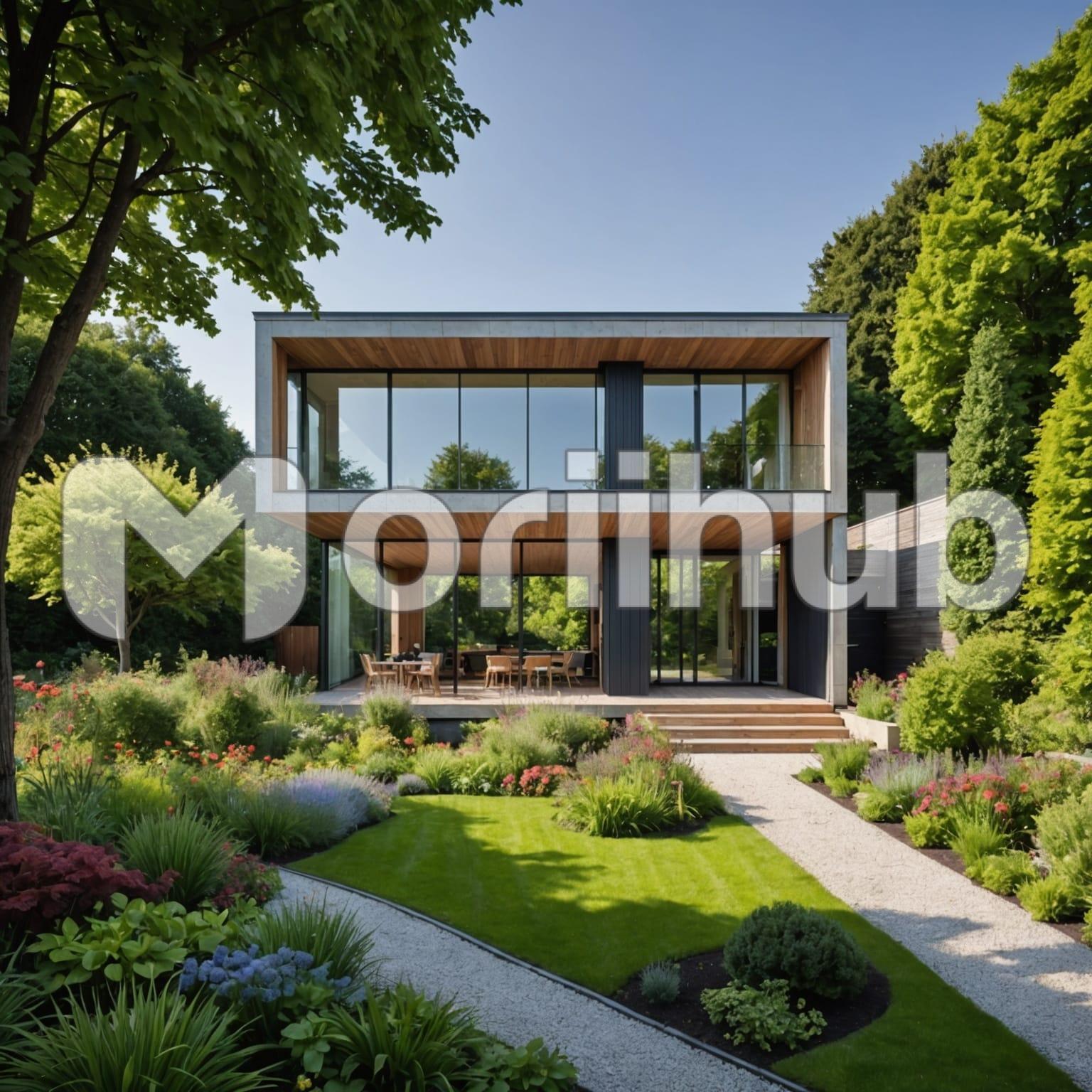 Nestled amidst lush greenery, the house stands as a serene retreat. Its large windows reflect the clear blue sky, creating a mirror-like effect that blends the structure with its natural surroundings. The facade is a harmonious blend of modern lines and rustic charm, complemented by vibrant foliage that frames the entrance and softens the edges. Sunlight filters through the canopy of trees, casting dappled shadows on the well-kept lawn. It’s a picture of tranquility and harmony, where the beauty of nature seamlessly integrates with the comforts of home.