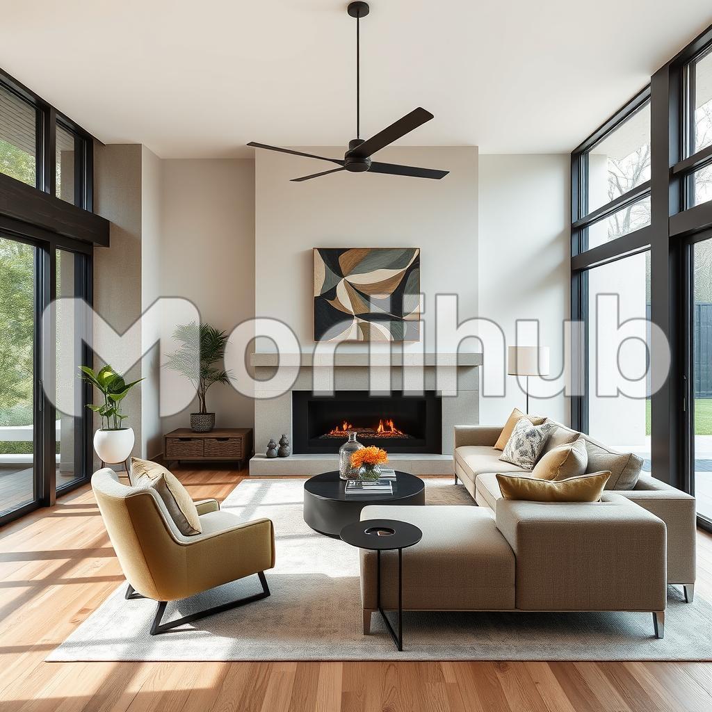 The living room exudes warmth and style, featuring cozy couches arranged invitingly around a sleek coffee table. Atop the table sits a vibrant flower pot, adding a touch of nature and color to the space. Above the fireplace, an eye-catching piece of abstract art draws attention, its bold shapes and hues creating a focal point. Sunlight streams in through large glass windows and doors, illuminating the room and enhancing the inviting atmosphere. The interplay of light and decor creates a serene ambiance, making this living space perfect for relaxation and gatherings.