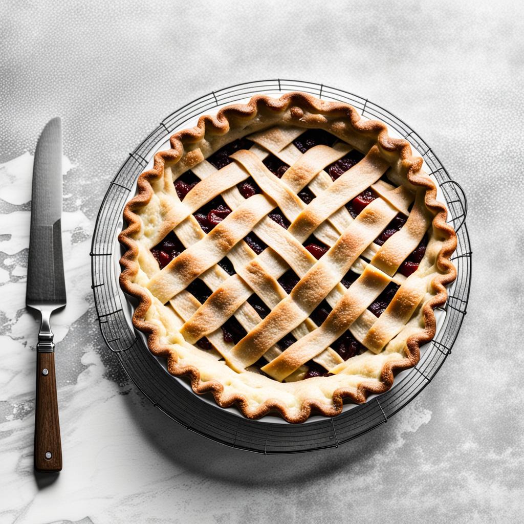 A tantalizing aroma envelops the kitchen as a freshly baked pie graces the countertop. Its golden crust, adorned with a lattice pattern, beckons with warmth and perfection. Adjacent, a gleaming knife promises the joy of the first, satisfying slice. Filled with a medley of fruits, the pie epitomizes homemade comfort. The scene captures the essence of anticipation, inviting indulgence in the delicious symphony of flavors and the artistry of a well-crafted dessert.