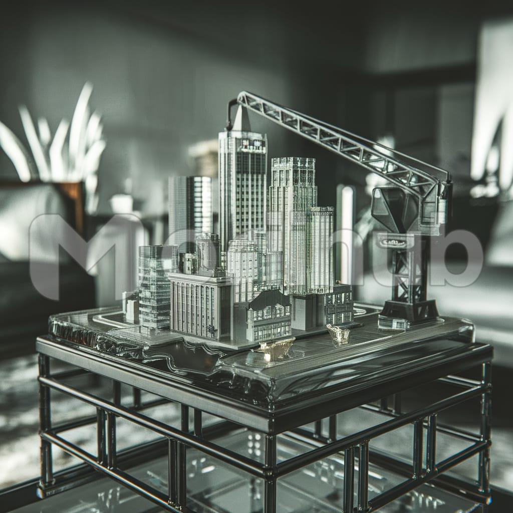 A miniature toy crane, meticulously crafted, is positioned atop an elegant table in the lobby of a luxurious five-star hotel. The crane, with its tiny, movable parts, is depicted in action, lifting a delicate piece of art. The art itself is an abstract sculpture, made of polished metal and glass, reflecting the sophistication of the hotel’s design. The crane’s intricate details, combined with the modern art piece, create a captivating scene that draws the attention of guests. The table, made of rich mahogany, complements the overall aesthetic, blending playful creativity with upscale elegance.