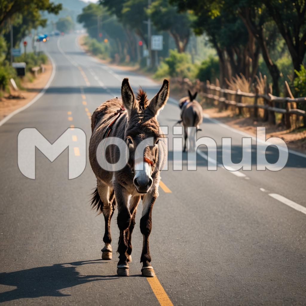 A donkey on the road embodies a scene of rustic charm and simplicity. With a patient demeanor, it plods along, bearing its load with steady determination. Its ears flick attentively, tuned to the sounds of the countryside. Amidst the backdrop of rolling hills and winding paths, the donkey serves as a humble reminder of timeless traditions and the enduring bond between humans and animals.