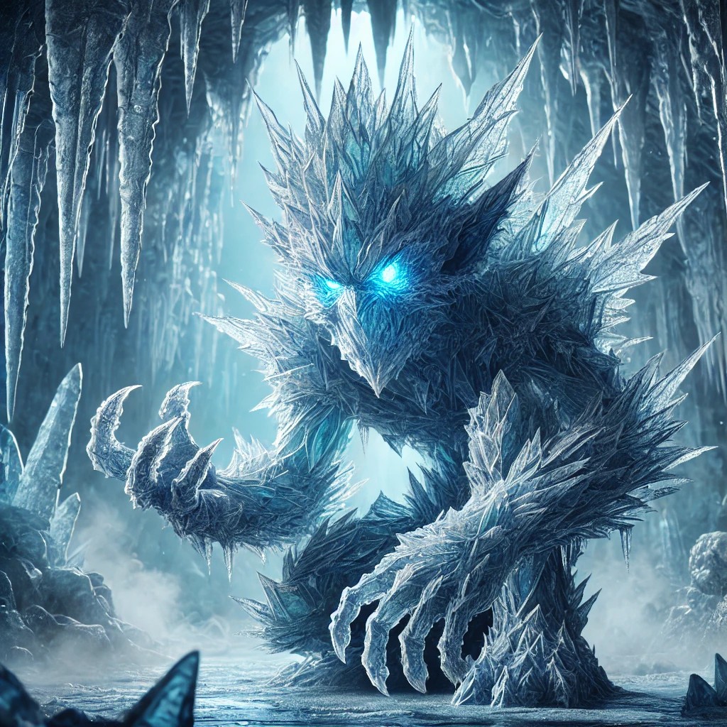 In the heart of a frozen cavern, an eerie goblin-shaped ice crystal stands, sculpted by nature and magic. Its jagged, translucent body glows with an otherworldly frost-blue hue, refracting the dim light that seeps through the icy stalactites above. The goblin’s glowing icy-blue eyes pierce through the cold mist surrounding it, giving it a sinister and mystical aura.