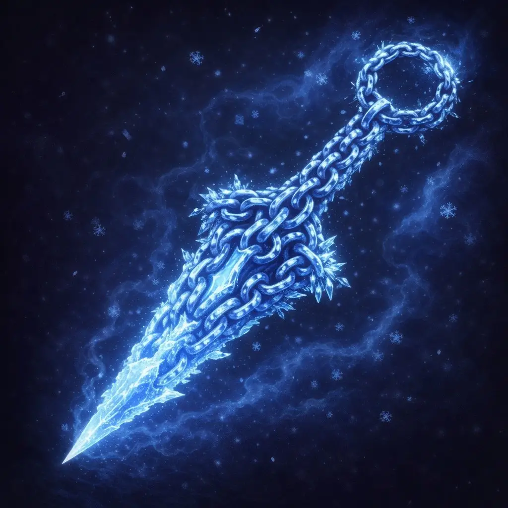 The ice-themed kunai is a striking weapon forged from chains, intricately interwoven to form its sleek, jagged blade. The weapon glows with an ethereal, icy light, and its edges appear sharp and crystalline, as if forged from pure frost. The handle is circular, made of the same cold, interwoven chains, and is adorned with sharp ice-like formations that add to its mystic, elemental appearance.
