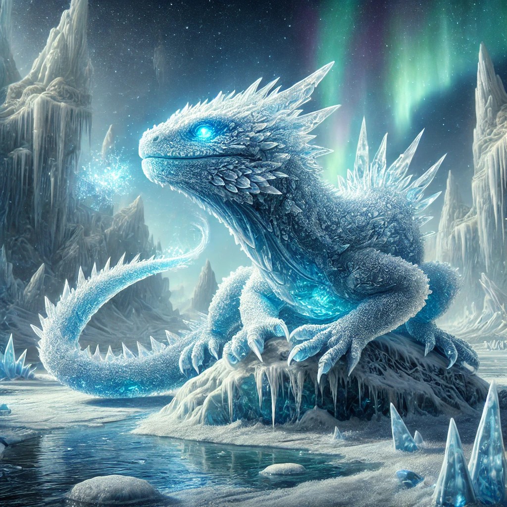 The image showcases a breathtaking crystal lizard infused with the ice element, perched on a frozen rock in a mystical tundra. Its sleek body is sculpted from translucent, icy-blue crystal, with frost-covered scales that shimmer under the cold light. The lizard’s piercing eyes glow with an ethereal icy blue hue, exuding an aura of ancient elemental power.