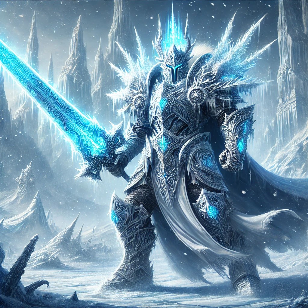 A powerful Ice Paladin stands on a frozen battlefield, surrounded by towering, jagged ice formations that glisten in the pale light of a winter sun. The Paladin is clad in gleaming, silver armor etched with intricate icy patterns, with frosty blue light emanating from the seams. His helmet has a plume of frost-covered feathers, and his cape flows like a sheet of ice in the wind.