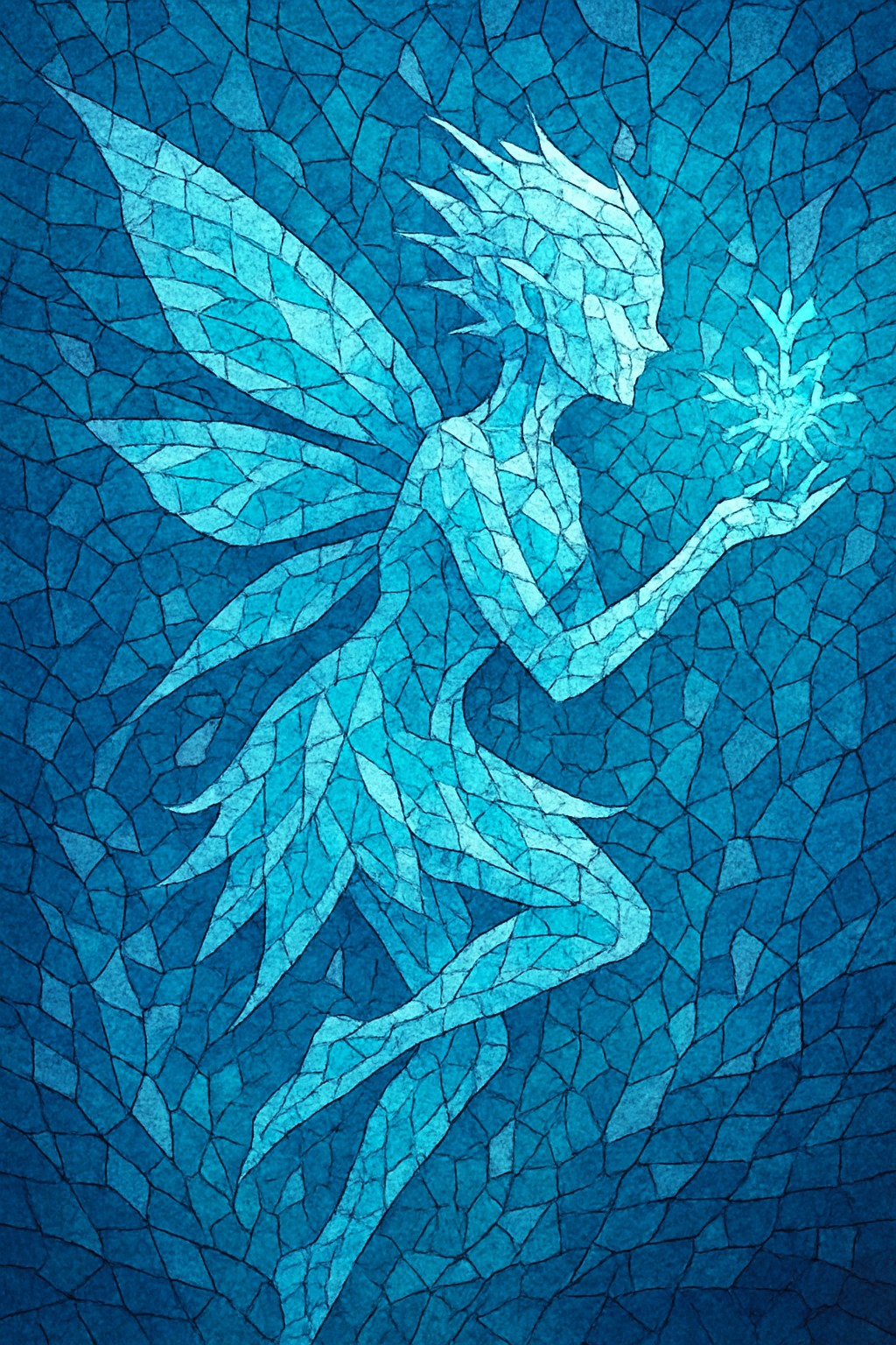 This image portrays a digital abstract mosaic of a pixie infused with the element of ice. The pixie is elegantly shaped from countless angular, polygonal tiles, predominantly in cool icy hues — shades of blue, turquoise, and white — giving her a crystalline, magical presence. She has large, translucent wings, similar to delicate frost patterns, and her hair appears wind-swept or icicle-like. Her pose is graceful and floating, with one arm extended forward, emanating a magical ice burst or snowflake pattern from her hand.