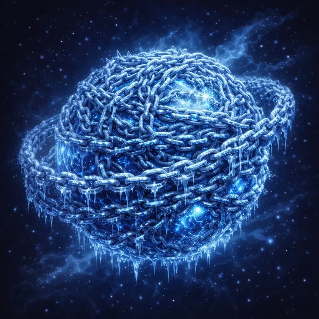 The image shows a frozen celestial planet completely bound in thick, interlocking chains made of ice and metal. The chains crisscross densely around the sphere, forming a heavy armored shell that almost hides the planet beneath. Each link is coated in frost and lined with sharp, hanging icicles that glisten in the cold blue glow radiating from the planet’s cracked surface.