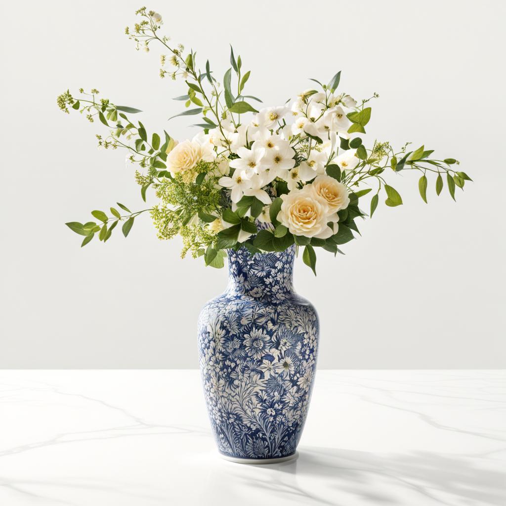 In a radiant interplay of light and shadow, an ornate flower vase takes center stage against a serene plain background. Bathed in a gentle glow emanating from a distant corner, the vase exudes opulence with intricate patterns and delicate craftsmanship. Within, a bouquet of resplendent flowers blossoms, their vibrant hues accentuated by the play of light. A subtle shadow cast by the vase adds depth, creating a visual poetry where the elegance of design converges with the natural beauty of blooming flowers in a captivating symphony of form and light.