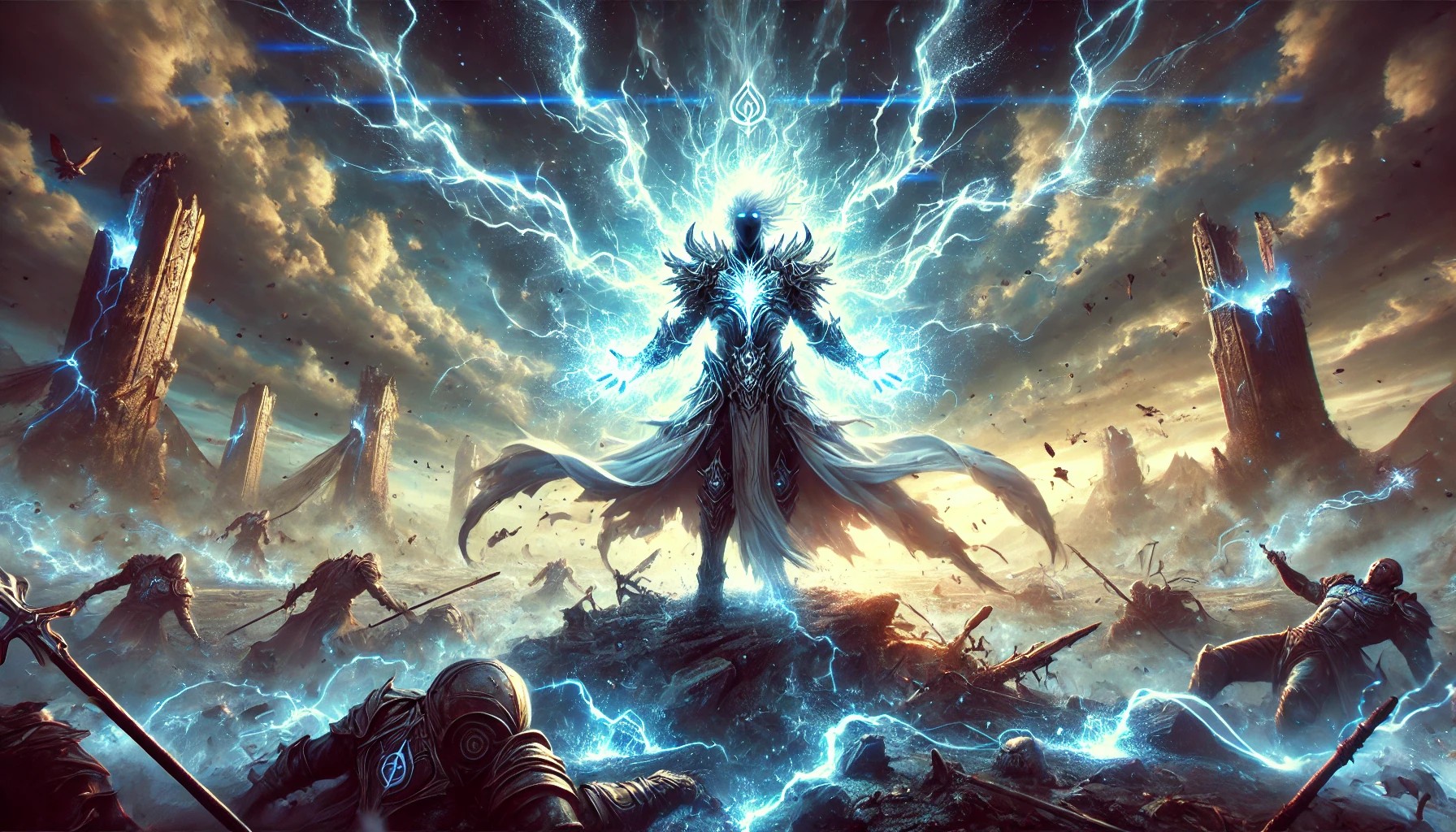 This illustration captures a moment of unmatched power and dominance in a fantasy setting. At the center stands a mighty warrior, their body pulsating with raw arcane energy. Clad in gleaming armor adorned with divine symbols, they exude an aura of unstoppable force. Their eyes glow with an ethereal light as arcane lightning crackles around them, illuminating the stormy sky above.