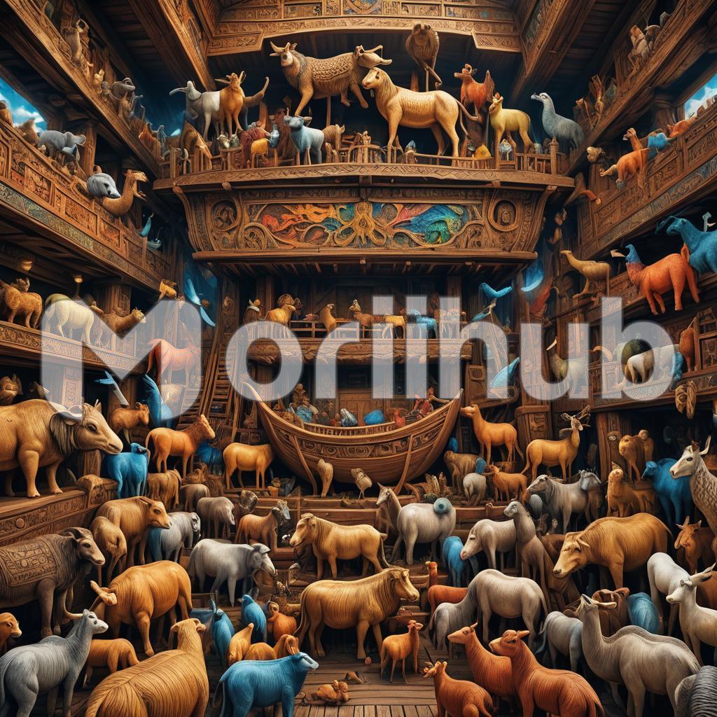 Inside the ark, the atmosphere is bustling with the sounds and sights of various animals, each nestled in their designated areas. The gentle hum of activity is punctuated by the lowing of cattle, the chattering of monkeys, and the occasional roar of a lion. Noah and his family move methodically, tending to the needs of each creature, ensuring they are fed and comfortable. The ark’s interior, crafted from sturdy wood, is divided into multiple levels, each housing different species. Amidst the controlled chaos, there’s a sense of harmony as predator and prey coexist peacefully, unified by their shared journey. The smell of hay and the warmth of the animals create a rustic, earthy ambiance. This remarkable vessel, a testament to human ingenuity and divine instruction, serves as a floating sanctuary, preserving life through the great flood.