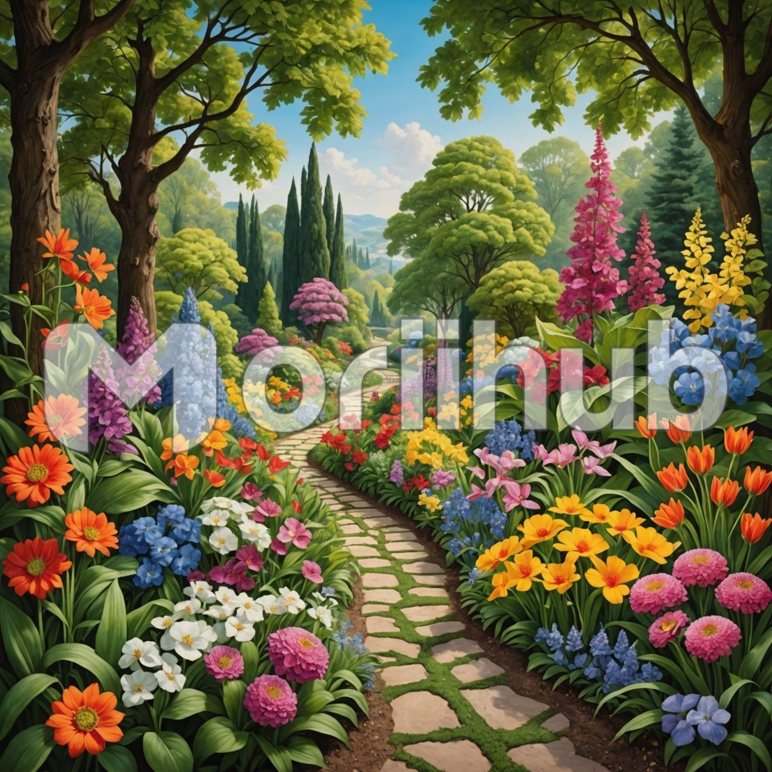 A charming cobblestone path winds through a garden bursting with blooming flowers. The stones, worn smooth by time, create a rustic, inviting walkway. Vibrant blossoms of every hue line the path, their petals open wide to the sun. The air is fragrant with the scent of flowers mingling into a sweet, intoxicating aroma. The path leads through this colorful, fragrant haven, inviting a leisurely stroll amidst nature’s splendid display.