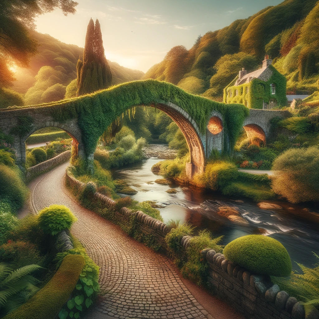 In this serene landscape, a charming stone bridge gracefully spans over a tranquil river, its arches a testament to timeless craftsmanship. Adorned with cascading ivy, it exudes an aura of rustic elegance, blending seamlessly with the surrounding natural beauty. Trees bow in reverence, their verdant canopy casting dappled shadows upon the peaceful waters below.