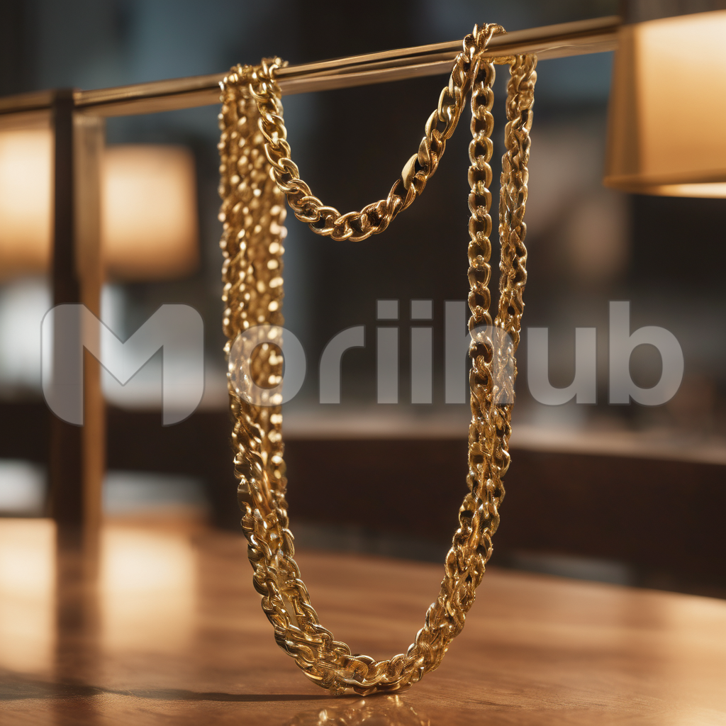 A radiant gold neck chain takes center stage on a polished table, creating an exquisite showcase of opulence. The gleaming links cascade elegantly, catching the light in a dance of reflections. Against the sleek backdrop, this golden adornment becomes a symbol of refinement and luxury, inviting admiration and captivating attention with its timeless allure.